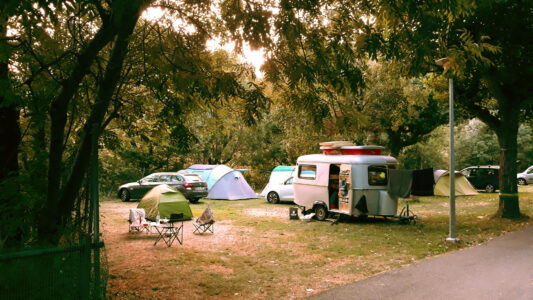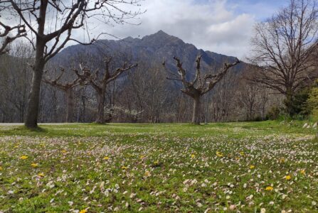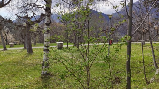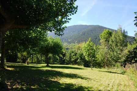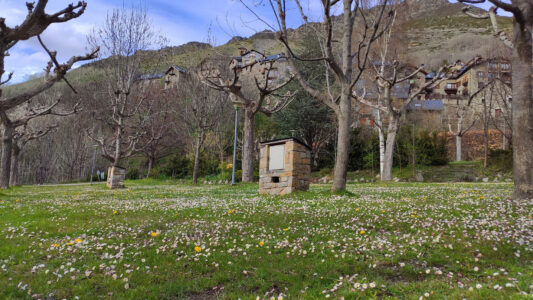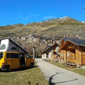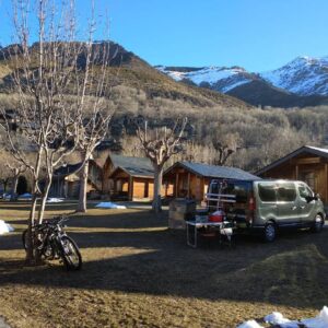 Zona verde de acampada, con vistas al pueblo de Taüll y a la famosa iglesia de Sant Climent emblema del conjunto románico de Patrimonio Mundial. Rodeados por la belleza de los más impactantes picos pirenaicos del valle, como el Aüt o el Raspa Roia.